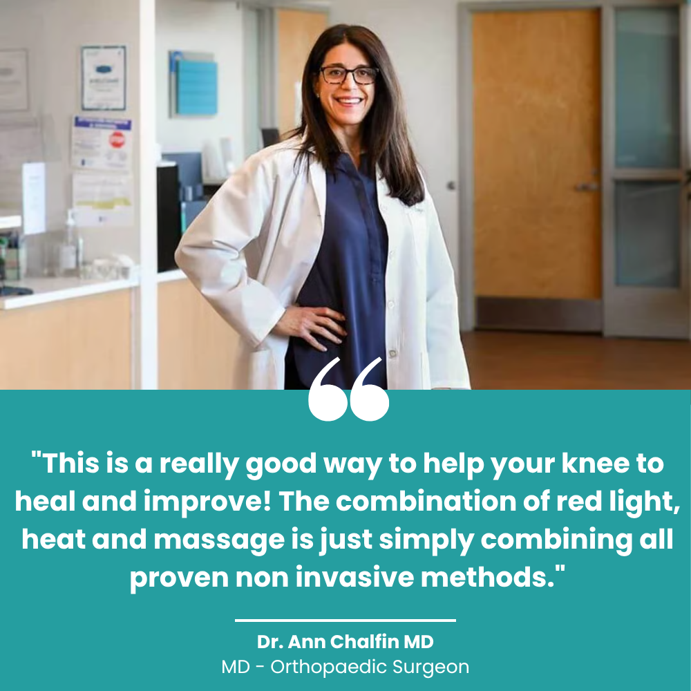 يستخدم RestoreKnee™ العلاج بالضوء الأحمر المستهدف والعلاج الحراري الذي يزيد من تدفق الدم ويزيل الالتهاب ويساعد في استعادة طبقة الغضروف الطبيعية في الركبة، مما يؤدي إلى عكس الضرر والقضاء على الألم المزمن وهشاشة العظام والتورم والتصلب.